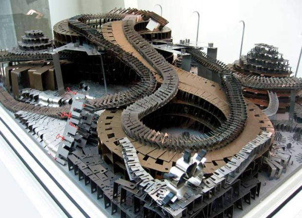 from Peter Root, about whom very little is known (his website is vague on this point), but who also makes amazing roller-coaster/future-blade-runner-high/low-rise slums out of transformer laminates.